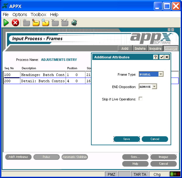 When you select the additional attributes option on the Input Process Frames screen, the input process frame Additional Attributes overlay is displayed as shown in Figure 3-6-7 below, where you can access additional parameters.