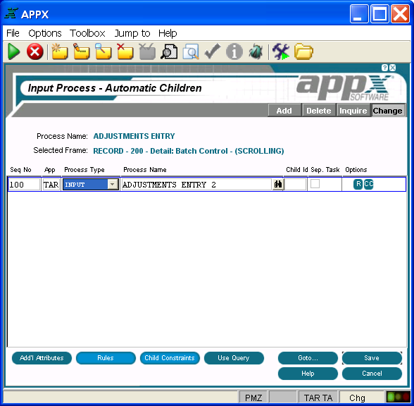 When you select the automatic children option from the Input Process Frames screen, the Input Process Automatic Children screen is displayed as shown in Figure 3-6-10. This allows you to attach a specific process to the input process frame currently selected so that it invokes automatically following execution of the frame. See Automatic and Optional Child Invocations in Chapter 3-1 as well as Chapter 3-13: Automatic and Optional Children for more information.