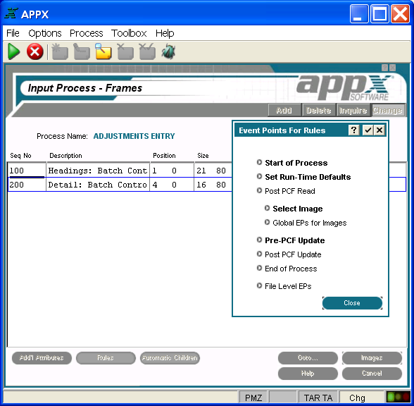 When you select the rules option on the Input Process Frames screen, the input process frame Event Points for Rules overlay is displayed as shown in Figure 3-6-8 below. This overlay provides options to access the ILF Editor for APPX event points. If statements are defined in an event point, the respective text on the screen is highlighted.