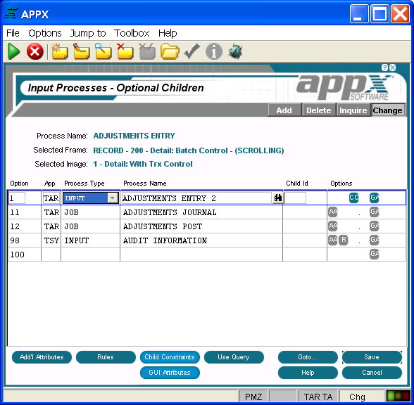 When you select the optional children option on either the Scrolling Input Images screen or the Non-Scrolling Input Images screen, the Input Process Optional Children screen is displayed as shown in Figure 3-6-16. This allows you to define attributes to govern the discretionary invocation of another APPX process from an image in an input process. See Automatic and Optional Child Invocations in Chapter 3-1 as well as Chapter 3-13: Automatic and Optional Children for more information.