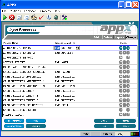 Input process specifications establish the general attributes of an input process, including a process control file and operational characteristics. The Input Processes screen, shown in Figure 3-6-2 below, displays when you select inputs from the Application Design Specifications Menu.