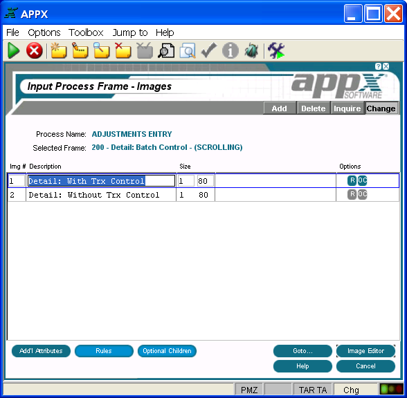 Img # displays a sequence number that is defaulted by APPX. The image number uniquely identifies each alternate image for the frame and is referenced when determining which image, if any, is to display. The first image that is defined in add mode is assigned alternate image number 1, and additional images are assigned a number equal to the highest existing image number, plus 1. The default number can be overridden, but must be unique within the frame. Refer to the Images section in Chapter 3-1 for a discussion of alternate images.