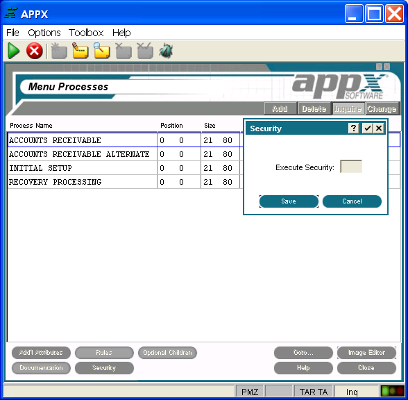 Execute Security identifies the APPX security code to which a user must have rights in order to run the process (menu, job, input, etc.). The security code must be four numeric digits. If blank, there are no restrictions.