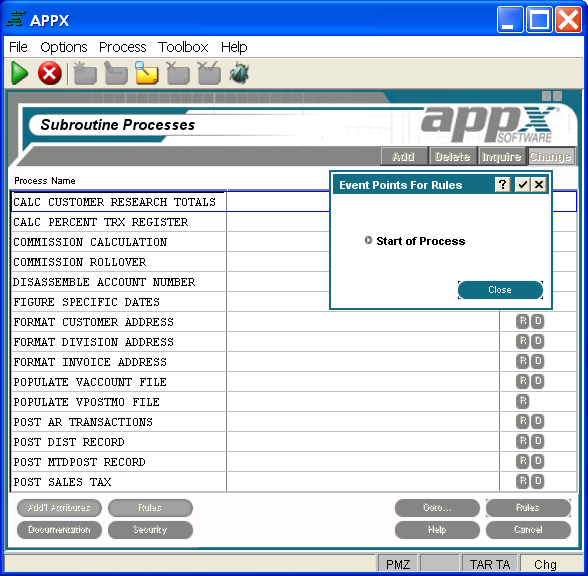 When you select the rules option from a Processes screen, an Event Points For Rules overlay is displayed. Figure 3-3-4 shows the overlay applicable for a subroutine process. It contains the only event point that is common to such overlays for all processes.