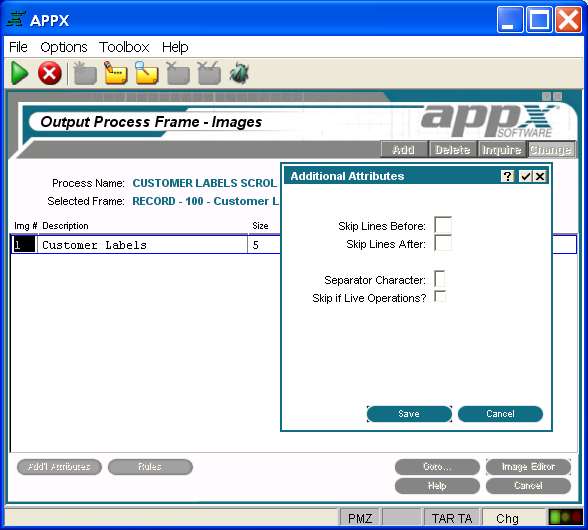When you select the additional attributes option on the Scrolling Output Images screen, the scrolling output image Additional Attributes overlay is displayed as shown in Figure 3-7-13 below, where you can access additional parameters.