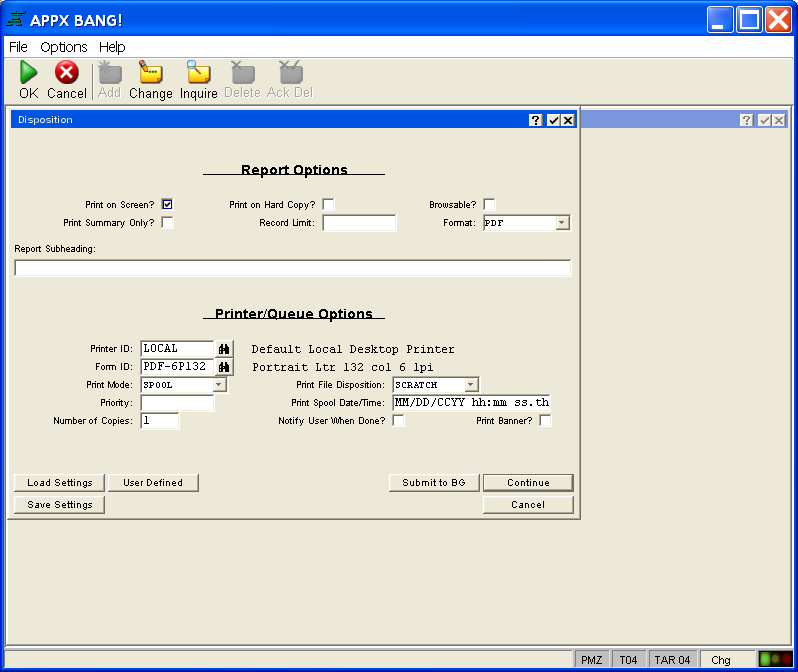 Format (optional) allows you to specify the desired format for the report as MPAGE, PCL, PDF, or TEXT. Most laser printers support PCL. Many support postscript. MPAGE and PCL cannot be used when printing to a local printer through a Windows client or when printing on a Windows server. They can be used if the client is a Linux desktop.